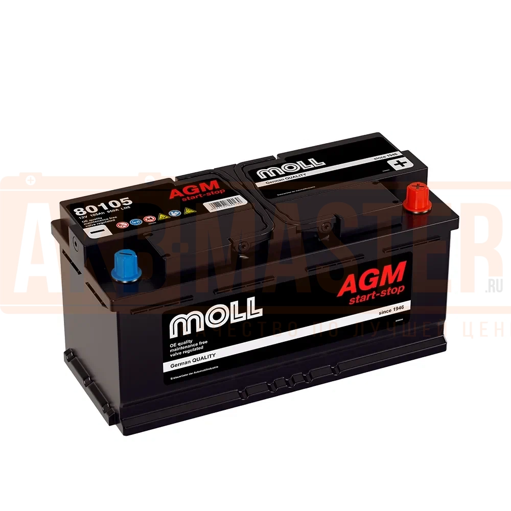 Автомобильный аккумулятор MOLL AGM Start - stop&Go 105 А·ч 950 А Обратная полярность 394x175x190 80105 B13